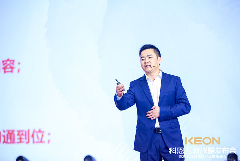 這一切成功的背后,除了有一支優秀的鐵血團隊,還有各地經銷商家人的支持陪伴,更重要的是有一位領航人不斷地探索。科恩電器董事長俞鋒上臺致辭,宣布峰會正式開始,“打造新科恩、重塑新科恩,再創科恩黃金十年”這一堅定目標和信念,伴隨洪亮的嗓音響徹全場。