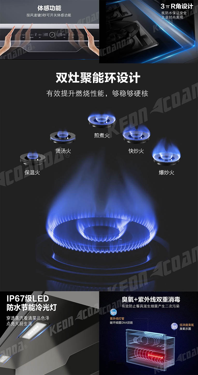 520告白季,科恩D520煙灶消款集成灶前來(lái)助陣,低空近吸體感操控,按風(fēng)俗健3秒可開(kāi)關(guān)體感功能,3πR角設(shè)計(jì),既防水保證安全,又顯高端時(shí)尚,雙灶聚能環(huán)5.0KW強(qiáng)大火力,爆炒更有勁,煲湯更有味,1-99分鐘自由選擇,烹飪完成時(shí)自動(dòng)熄火,開(kāi)關(guān)紅外線(xiàn)2秒延時(shí),防止了誤觸,同時(shí)產(chǎn)品采用一鍵自動(dòng)清洗,減輕你美麗雙手負(fù)擔(dān),內(nèi)部一鍵自動(dòng)清潔。消毒柜采用臭氧+紫外線(xiàn)雙重消毒,有效防止了餐具滋生細(xì)菌產(chǎn)生的二次污染,西門(mén)子冰箱門(mén)拉手,貼心高氧化鈦合金材質(zhì),耐用又好看!愛(ài)她,就要保護(hù)她,科恩D520集成灶,給她全方位的守護(hù)!