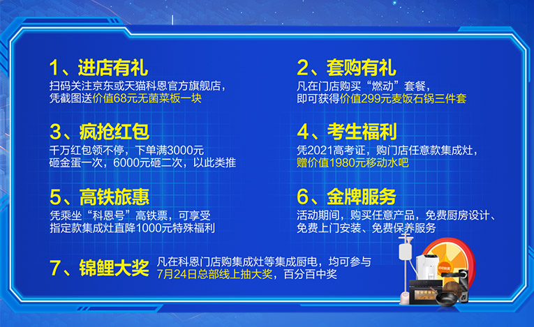 集成灶十大品牌、廚電行業(yè)十大品牌科恩燃動(dòng)七月舌尖之旅——邂逅幸福美味,七大特權(quán)享不停,進(jìn)店有禮:掃碼關(guān)注京東或天貓科恩官方旗艦店,憑截圖送價(jià)值68元無(wú)菌菜板一塊;套購(gòu)有禮:凡在門店購(gòu)買“燃動(dòng)”套餐,即可獲得價(jià)值299元麥飯石鍋三件套;瘋搶紅包:千萬(wàn)紅包領(lǐng)不停,下單滿3000元即可砸金蛋一次,6000元砸二次,以此類推;考生福利:憑2021高考證,購(gòu)門店任意款集成灶,贈(zèng)價(jià)值1980元移動(dòng)水吧;高鐵旅惠:憑乘坐“科恩號(hào)”高鐵票,可享受指定款集成灶直降1000元特殊福利;金牌服務(wù):活動(dòng)期間購(gòu)買任意產(chǎn)品,可享受免費(fèi)廚房設(shè)計(jì)、免費(fèi)上門安裝、免費(fèi)保養(yǎng)服務(wù);錦鯉大獎(jiǎng):凡在科恩門店購(gòu)集成灶等集成廚電,均可參與7月24日總部線上抽獎(jiǎng)。