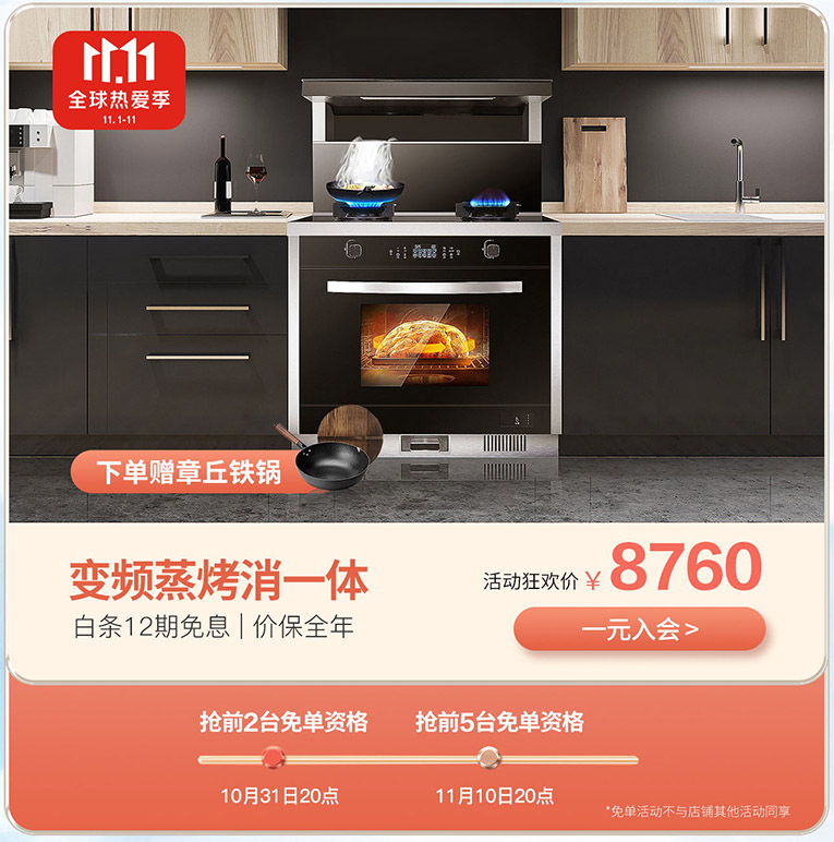 科恩集成灶雙11爆款搶免單,新一代變頻蒸烤消一體集成灶,八大烹飪模式蒸烤合一,集成灶選變頻,更省心!D151X變頻大吸力蒸烤消一體集成灶雙11狂歡價(jià)8760元,11月10日20點(diǎn)前5臺(tái)下單就有機(jī)會(huì)免單;