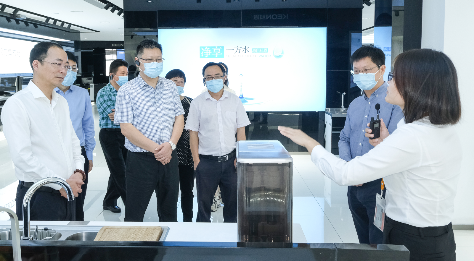 隨后,在俞總的帶領下,領導們參觀了移動水吧展廳,對移動水吧“免費體驗0風險,以一抵九多功能,只換不修售后優”表示了極大的贊賞和肯定,并詳細詢問了關于移動水吧的技術創新、產品研發和市場營銷等情況,充分肯定了科恩電器在產品研發與市場開拓中的專業性和嚴謹性。