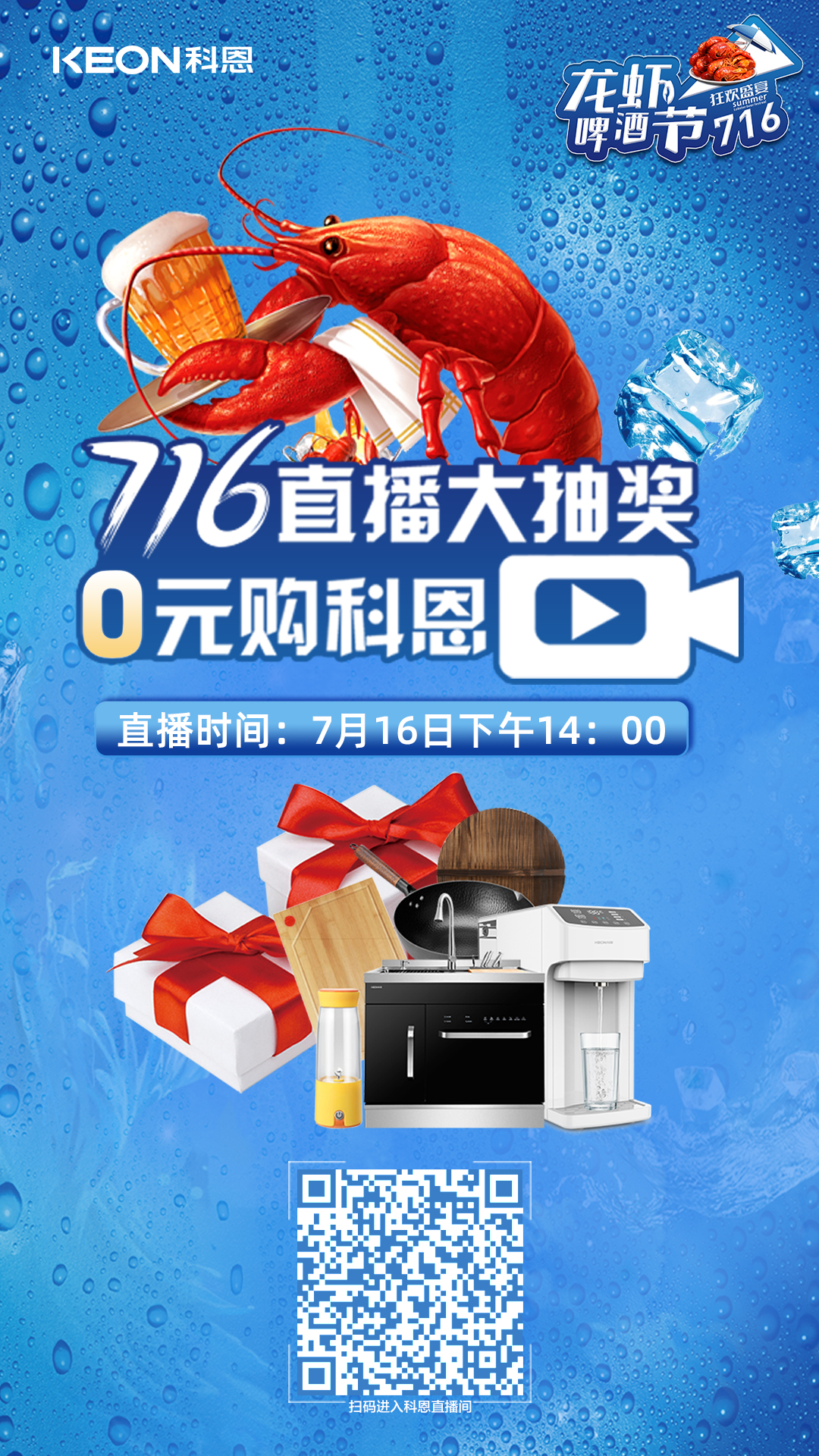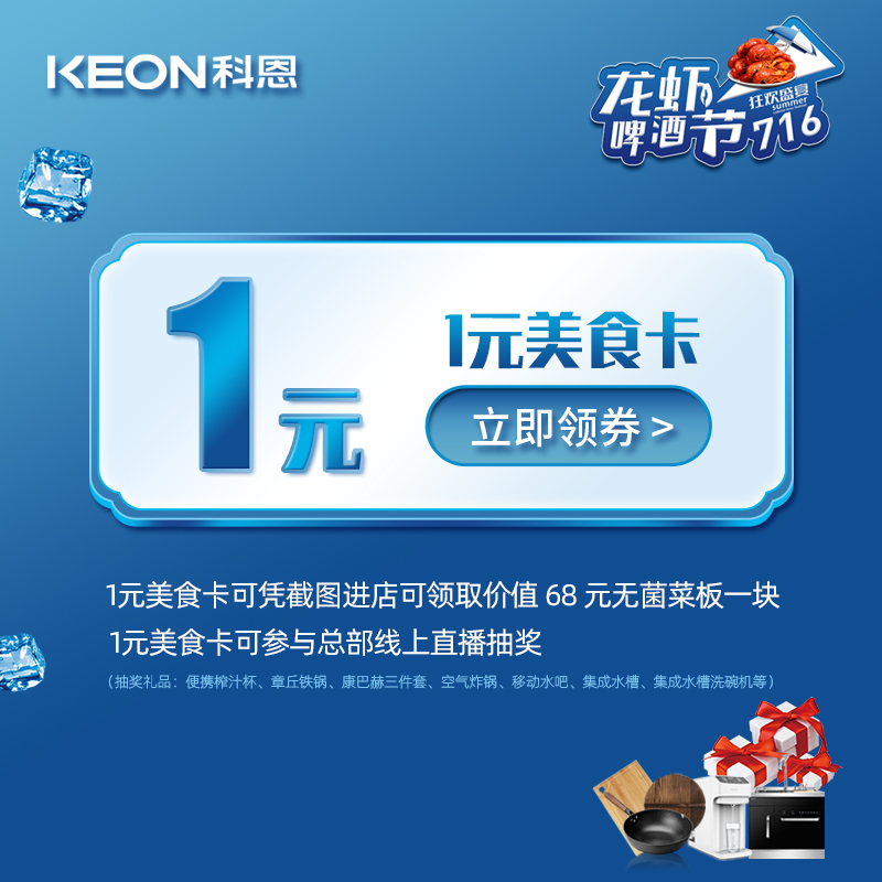 這還不夠,7月16日14點,716直播大抽獎準時開播,活動期間,凡購買1元美食特權卡用戶不僅可憑截圖進店領取價值68元無菌菜板一塊,還可參與716總部線上直播大抽獎,看直播中大獎,便攜榨汁杯、章丘鐵鍋、康巴赫三件套、空氣炸鍋、移動水吧、集成水槽、集成水槽洗碗機等海量豪禮抽不停!科恩寵你,不講道理!