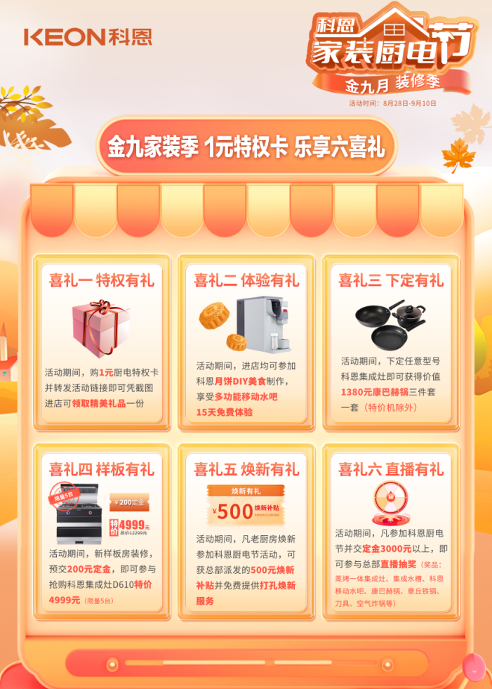 科恩電器早已提前為大家備好了金九銀十家裝好物,寶劍出鞘正待此時,【金九科恩家裝廚電節】即將火爆開啟,你要的優惠、美食、直播、大獎,全在這里!更多驚喜,只等你來全國各大科恩專賣店一探究竟!