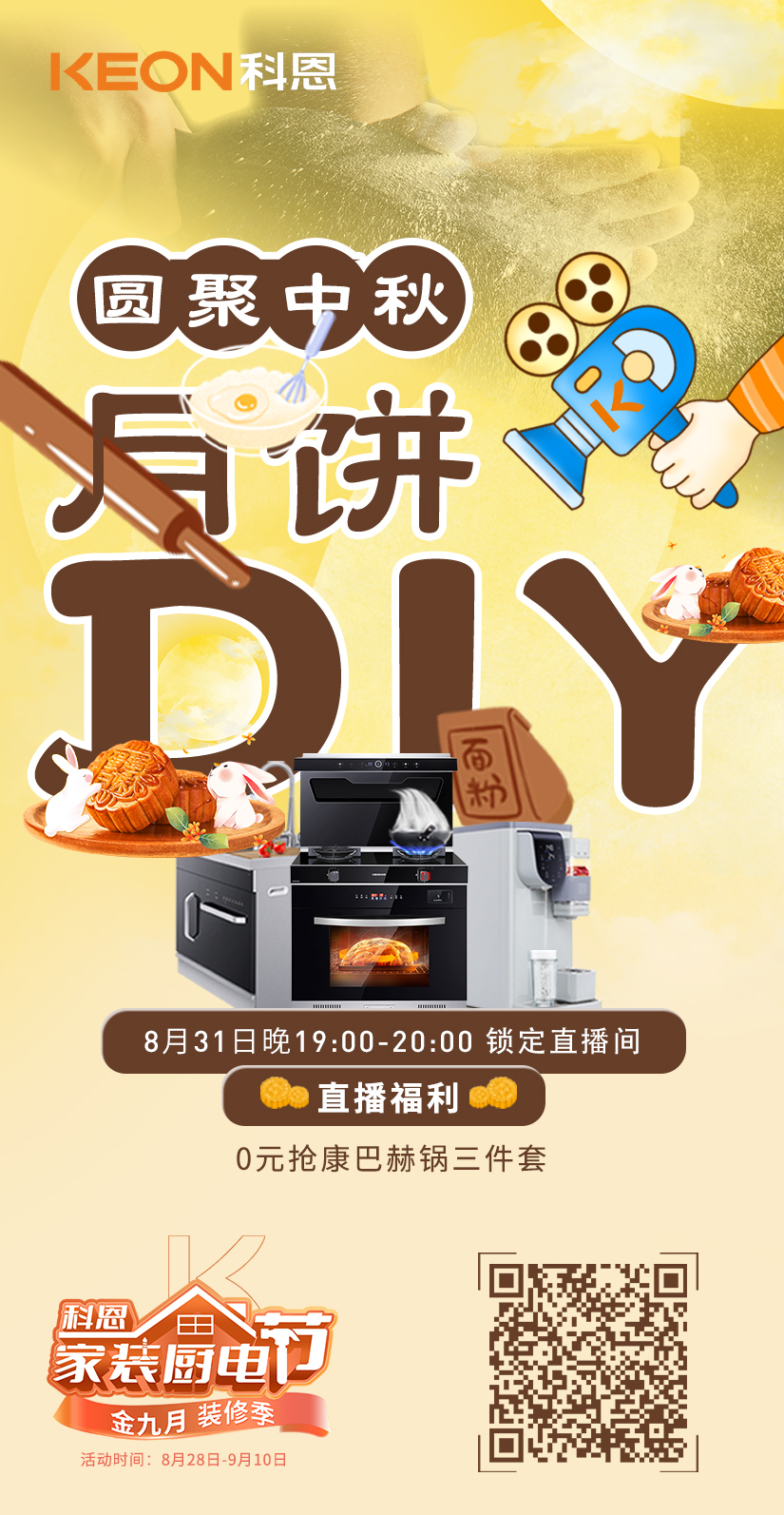 講真,吃久了外面買的月餅,總有那么一刻想要自己做來試試,而看到種種月餅DIY教程,呃……似乎難度……有點大!!!!于是!科恩集成灶就貼心的在科恩家裝廚電節活動期間安排了【圓聚中秋,月餅DIY】為主題的直播活動!手把手教你用科恩集成灶做高顏值的中秋月餅,而且據說直播現場還有0元搶康巴赫鍋三件套的壕氣福利!