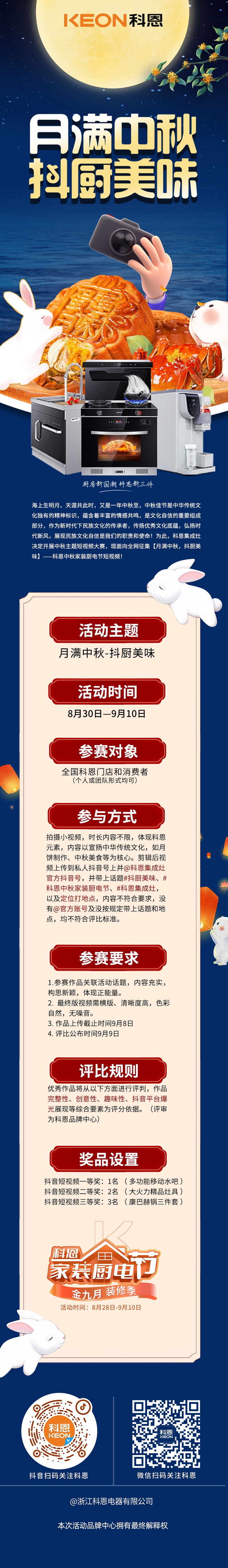心動不如行動!除了1元享特權和直播大抽獎活動,小科還為大家準備了【月滿中秋,抖廚美味】科恩家裝廚電節中秋短視頻征集活動,炫酷、創意、戲精、腦洞、鬼馬,你想不想拍一段能“火”的視頻?拿起手機,“抖”出精彩,你敢拍我就敢送!