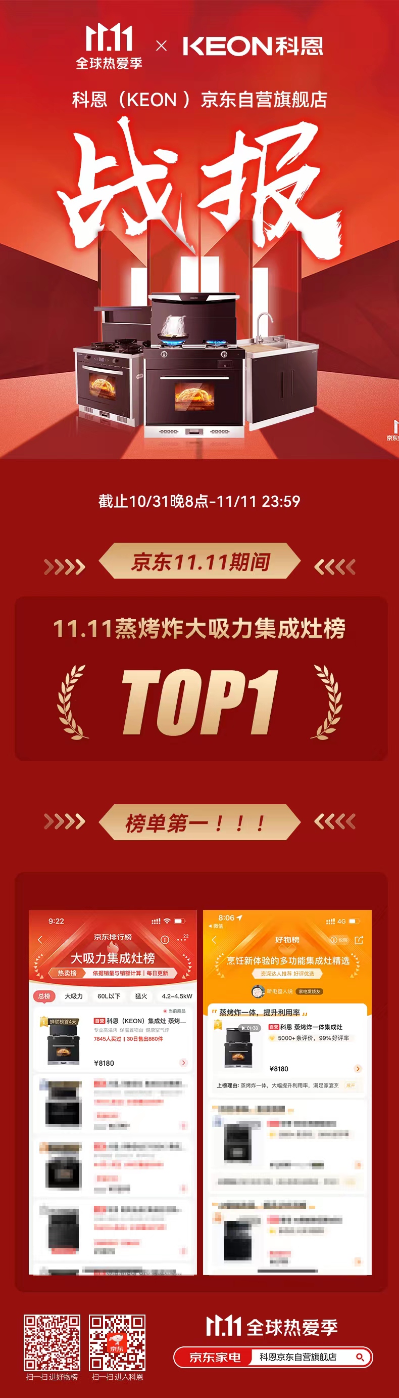 雙11全民狂歡盛宴完美落幕,科恩集成灶雙11終極戰(zhàn)報來襲,科恩集成灶火力全開,斬獲雙料第一:蒸烤炸大吸力集成灶榜TOP1,烹飪新體驗多功能集成灶TOP1,強大品牌號召力毋庸置疑,科恩速度,實力盡顯!