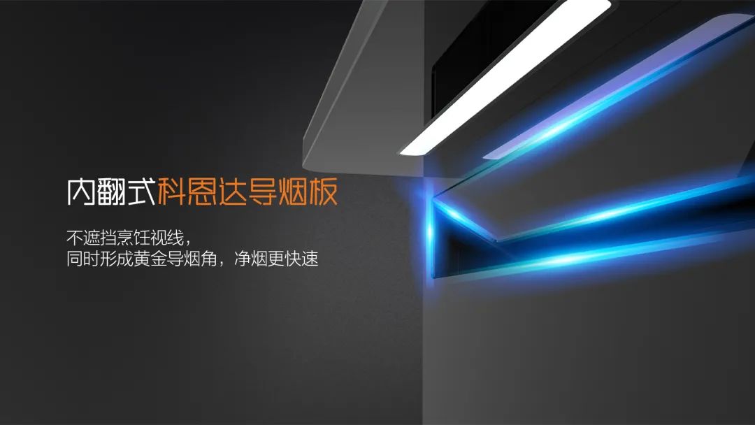 內(nèi)傾科恩達導煙網(wǎng)板,智能開合,獨有黃金吸煙角,不擋視線,吸煙更給力,烹飪更寬敞。