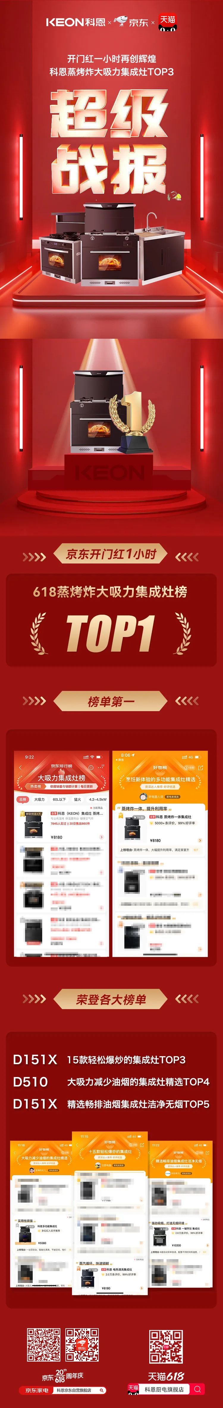 5月31日20:00,618開(kāi)門(mén)紅正式開(kāi)啟。在這場(chǎng)各大品牌的“首波交鋒”中,科恩集成灶表現(xiàn)尤為亮眼。截至5月31日21:00,科恩集成灶斬獲京東蒸烤炸大吸力集成灶TOP1,蟬聯(lián)第一!