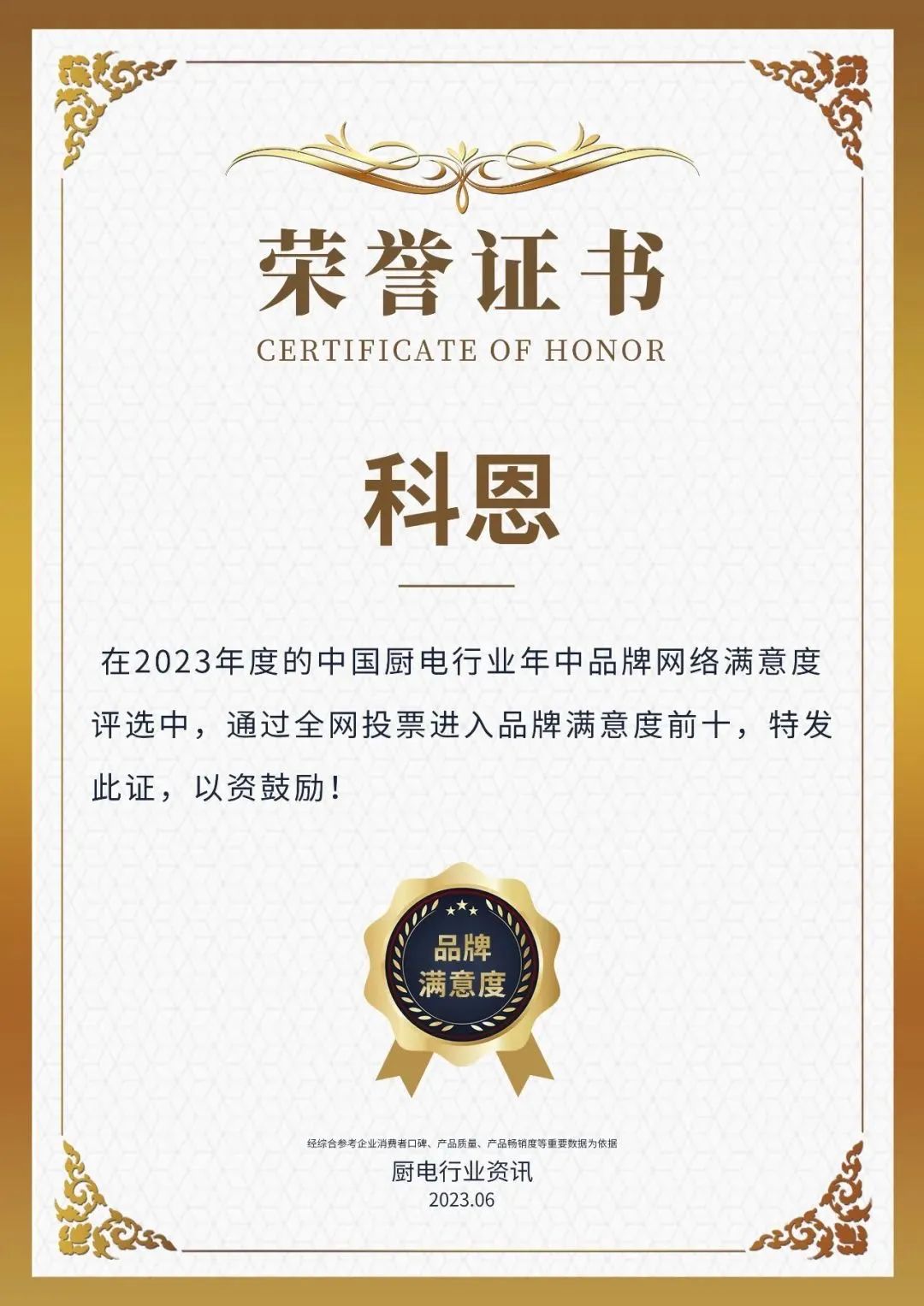 6月16日,浙江科恩電器有限公司再度榮獲“2023年度中國(guó)廚電行業(yè)品牌年中網(wǎng)絡(luò)滿(mǎn)意度前十”、“2023年度中國(guó)集成灶行業(yè)品牌年中網(wǎng)絡(luò)滿(mǎn)意度前十”!
