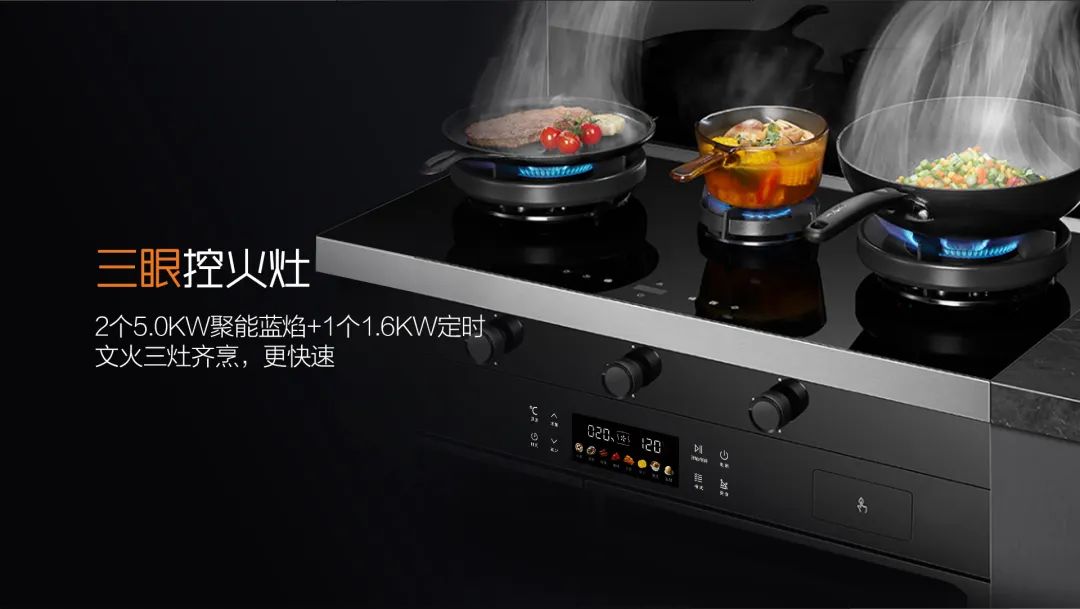 科恩A3系列獨(dú)特的三眼控火灶設(shè)置,2個5.0KW聚能藍(lán)焰+1個1.6KW定時文火,開一次火就可搞定兩菜一湯!