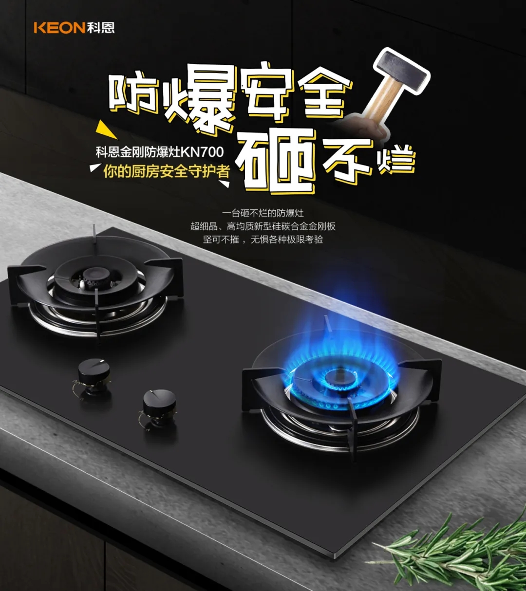 灶具則選擇了科恩KN700金剛防爆灶。近年來廚房事故頻發(fā),灶具炸裂不再少數(shù)。因此,科恩KN700金剛防爆灶在材質(zhì)上選擇了防爆金剛板,硅碳合金特種材質(zhì)可耐高溫1500℃,高于國標3倍以上,更安全!在抗沖擊方面,防爆金剛板是能抗住工地大鐵錘的暴擊,真正做到0級防爆高硬度,更堅固,更安全!如此有效杜絕了廚房安全事故。