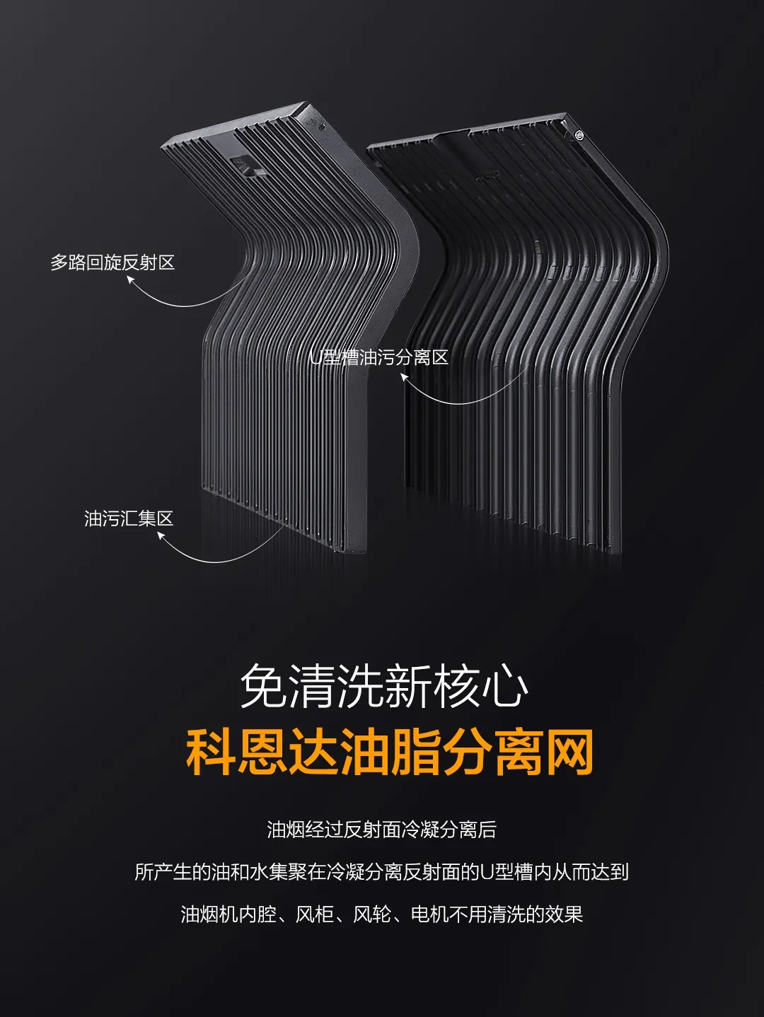 科恩達(dá)油脂分離網(wǎng)采用易潔太空壓鑄鋁材,相較于其他材質(zhì),更耐高溫、更易潔。
