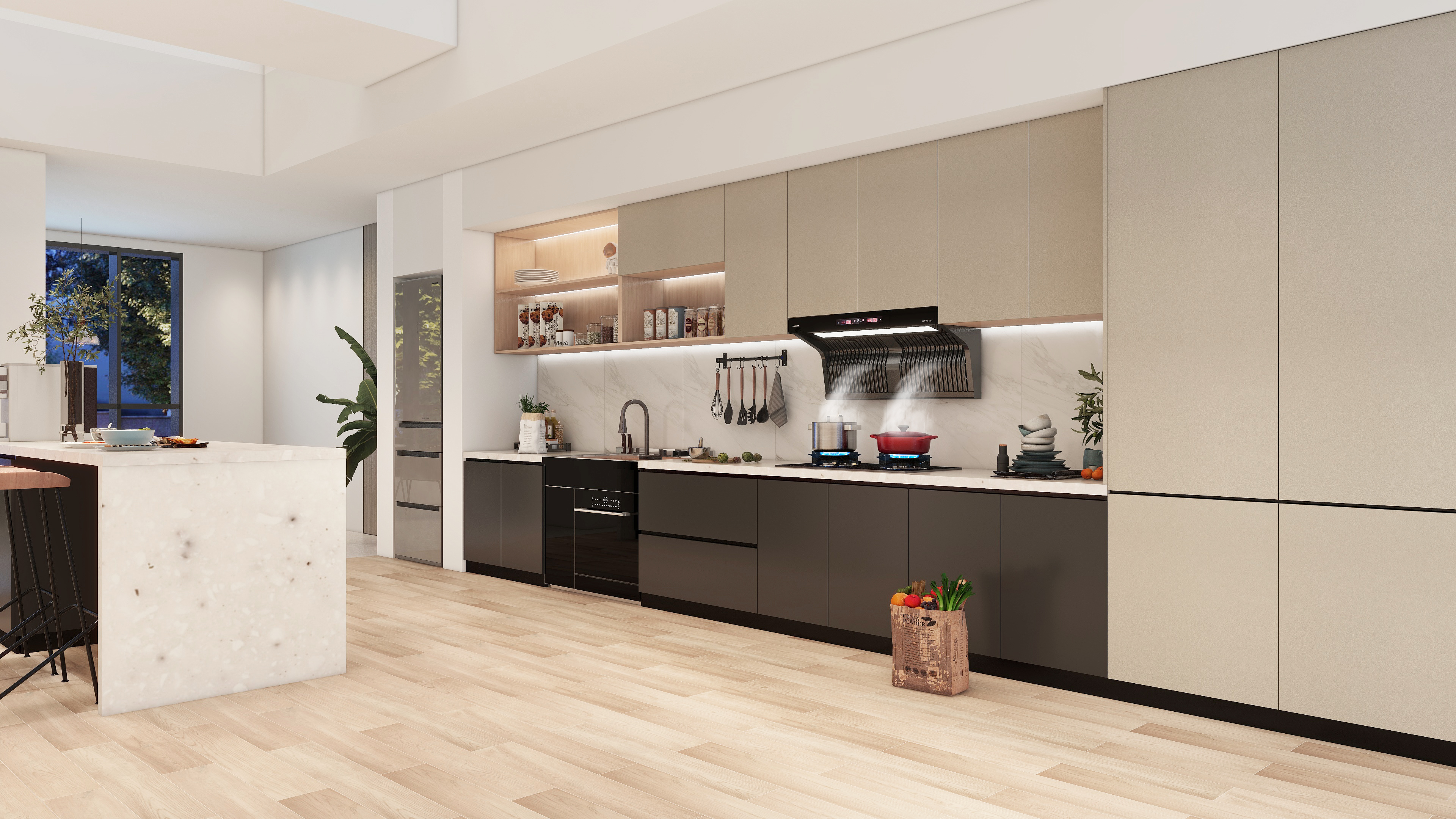 年輕一代都偏愛,半開放式及開放式廚房。一是考慮到美觀度,還有一個就是陪伴!相對于老一代悶聲在廚房烹飪,年輕一代更喜歡在烹飪的時候與家人、朋友一起聊聊天。在這種新生的趨勢中,人們對廚房的期待,已經不僅是為了“忙活出一頓飯”。