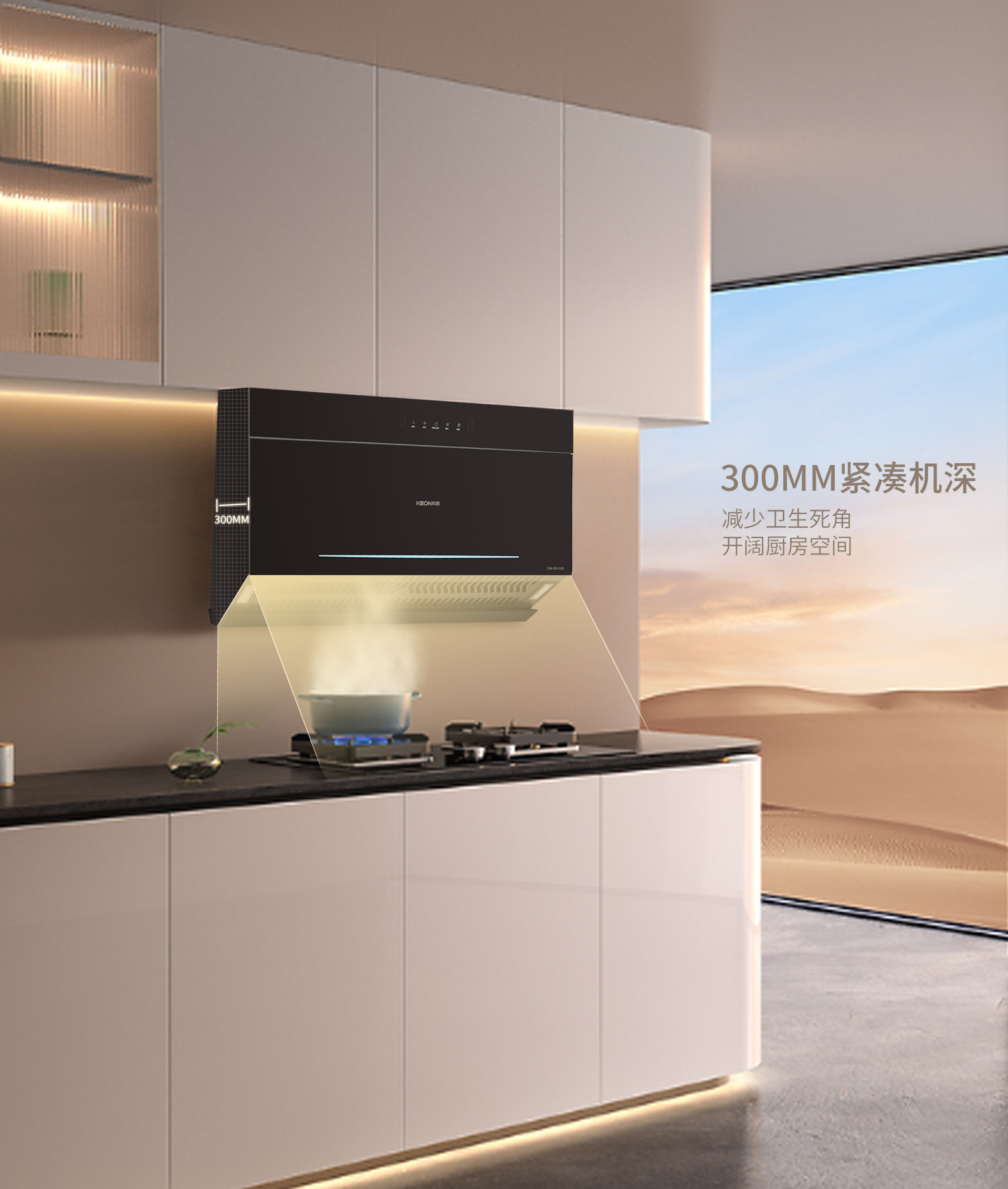此外,科恩3320煙機的攏、吸、排三點一線設計,實現了暢吸直排,高效凈煙。無圍板直排設計釋放了更多櫥柜空間,讓廚房更加整潔寬敞。