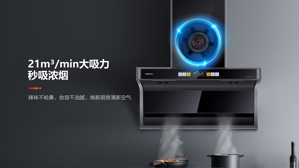 21m3/min颶風吸力,瞬吸濃煙,辣味不嗆鼻,煥新廚房清新空氣